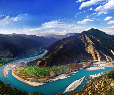 位于云南省西北部的迪慶藏族自治州香格里拉縣南部沙松碧村與麗江市石鼓鎮之間的長江第一灣,海拔18米,距香格里拉縣城130公里,有公路直達。萬里長江從“世界屋脊”——青藏高原奔騰而下,巴塘縣城境內進入云南,與瀾滄江、怒江一起在橫斷山脈的高山深谷中穿行形成了“三江并流”的壯麗景觀。到了香格里拉縣的沙松碧村,突然來了個100多度的急轉彎,轉向東北,形成了罕見的"V"字形大彎,“江流到此成逆轉,奔入中原壯大觀”,人們稱這天下奇觀為“長江第一灣”。