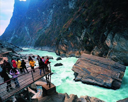 虎跳峽,以“險”名天下,是中國最深的峽谷之一。虎跳峽有香格里拉段和麗江段和之分,而香格里拉虎跳峽是國家AAAA級旅游風景名勝區,它包括上、中、下虎跳峽,高路徒步線,其中:虎跳峽徒步線被譽為“世界十大經典徒步線路之一”,主要由高路徒步線和中虎跳峽徒步線兩大部分組成。虎跳峽位于香格里拉市虎跳峽鎮境內,距香格里拉市96公里,距麗江市80公里。在云南省玉龍納西族自治縣(原麗江納西族自治縣)龍蟠鄉東北。峽谷長17千米,南岸玉龍雪山主峰海拔5596米,北岸中哈巴雪山海拔5,396米,中間江流寬僅30-60米。虎跳峽的上峽口海拔1800米,下峽口海拔1630米,兩岸山嶺和江面相差2500-3000米,谷坡陡峭,蔚為壯觀。江流在峽內連續下跌7個陡坎,216米短距離落差。水勢洶涌,聲聞數里,為世界上最深的大峽谷之一。舊時曾因山崩截斷江流,至今尚有崩積物遺留。另有廣東信宜虎跳峽與之同名。
