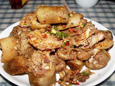 記得導游把我們領進了當地一個土司家里,熱情好客的主人立刻招呼我們入座,剛剛坐定便讓我們體驗了彝族人喝轉轉酒的風俗。彝族人吃肉從來離不開酒,他們有“客人到家無酒不成敬意”的傳統,并且習慣喝轉轉酒,即先將酒倒進一個大碗里,然后從首座的客人開始,依次順延,每人喝一口,直到將碗中的酒喝完。 看看桌上的兩盤坨坨肉,我有點驚異,因為從未見過這么大塊的肉,小者如拳、大者如碗,每塊大約有二三兩重。主人熱情地夾了一塊最大的給我,我端詳起這傳說中的坨坨肉,真是好大一塊肉啊!它富有彈性,肥肉和瘦肉的比例基本上均衡,我試著嘗了一口,真香呀。肥肉一點都不膩人,而瘦肉則非常脆嫩,入口即化,給人的感覺是肉質香鮮可口。于是我越嚼越香,越吃胃口越開。再加上喝了主人遞過來的美酒,我可真正體會到了“大塊吃肉、大口喝酒”的愜意。 看我們大快朵頤吃得興起,導游介紹說,坨坨肉是彝族最有名的美食,在彝語中稱“烏色色腳”,意思是豬肉塊塊。彝族人的坨坨肉展現了他們待客的熱情大方,也讓人看到他們粗獷豪放的一面。坨坨肉的烹制方法是,將肉(牛、羊、豬、雞等肉皆可)切成拳頭大小的塊狀,入鍋加水煮熟后撈出,撒上鹽、辣椒面、花椒、蒜泥、穆庫(調料的一種,指喬木“穆庫”的根和花)即可。坨坨肉的烹制方法看起來簡單,其實還是很講究烹飪技藝的。首先要選當地按照傳統放牧方式自養的仔豬為原料,按照彝族的傳統方法“燒毛豬”宰殺,開膛后小心取出內臟,肉身不再清洗,以保證肉的鮮度,并隨即將肉切成扁方形的肉坨坨,放入鍋中。其次,關鍵是掌握火候,坨坨肉放入鍋里的冷水中,煮時放些木姜子入湯,一般不再放入其他調料,待冷水煮開后,再加入一些冷水,使之暫時冷卻,待第二次煮開時,肉正好熟透,馬上將肉撈出。最后,須趁肉熱時拌調各種作料,使肉入味。這樣做出的坨坨肉味醇厚、肉質細嫩且鮮美。