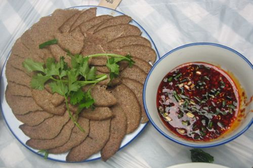 “寺不”是納西族的一道遠近聞名的風情名菜,納西語意為“吹肝”。是將豬肝充分使之膨脹,塞入精鹽、五香粉、姜絲、火硝、紹酒、腌漬后取出,再撒上花椒粉風干。食 用時將“寺不”放入湯鍋,加辣椒果、姜、花椒,用文火慢煮,取出切成片。色澤鮮潤。麻辣芬芳,且耐貯存,可保持一年風味不變。肉色彩透明,見之令人垂涎欲滴,可煮可燉,是藏人待 客的佳肴。