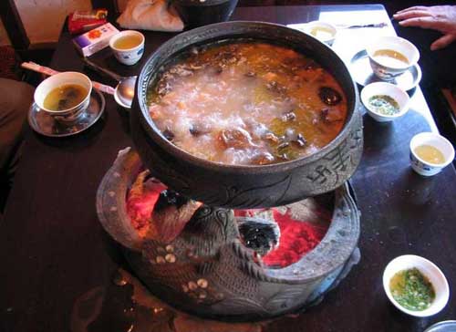 尼西土鍋雞,一定要用尼西土陶燉制而成,不需要高超的烹飪手藝,原汁原味,營養豐富,這就是尼西土鍋雞精髓所在。用尼西土鍋燉出的藏香雞湯色澤金黃,濃香撲鼻,鮮香味美。品嘗過這種滋味的人只怕今生難以忘懷。 尼西土鍋雞用的藏香雞就是放養高原土雞。配料用的辣椒是尼西特產尼西辣椒,藏香雞體型小,一般不超過一公斤。因高原藏香雞獨特的品種加上是放養長大的,脂肪少,口感很好。據說飛的高的藏香雞可以飛到兩米多高。 有人這樣形容藏香雞:“草原雞的自然,烏雞的滋養,珍珠雞的玲瓏,取之精華,集之大成,世界脊梁上,孕育出這雞界的珠穆朗瑪。香格里拉藏香雞它比普通雞營養更豐富,品質更高,是高蛋白,低脂肪,高能量老少皆宜的美味佳肴。藏香雞素以覓食能力強、肉質細嫩鮮美而著稱。[1] 尼西是一個美麗的藏族部落,因善制黑陶(又稱土鍋)而聞名滇西北,尼西黑陶工藝世代相傳已有近千年歷史。舊時的茶馬古道曾把尼西土鍋帶向了四面八方。尼西黑陶是香格里拉尼西村的一種紅土而制成的。如果說建水紫陶世溫文爾雅,賞心悅目的話,那尼西黑陶就猶如藏族大漢,奔放豪爽。同樣是由紅土制成,而尼西村的紅土燒出來的陶土就是墨黑的上篇: